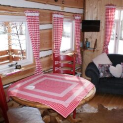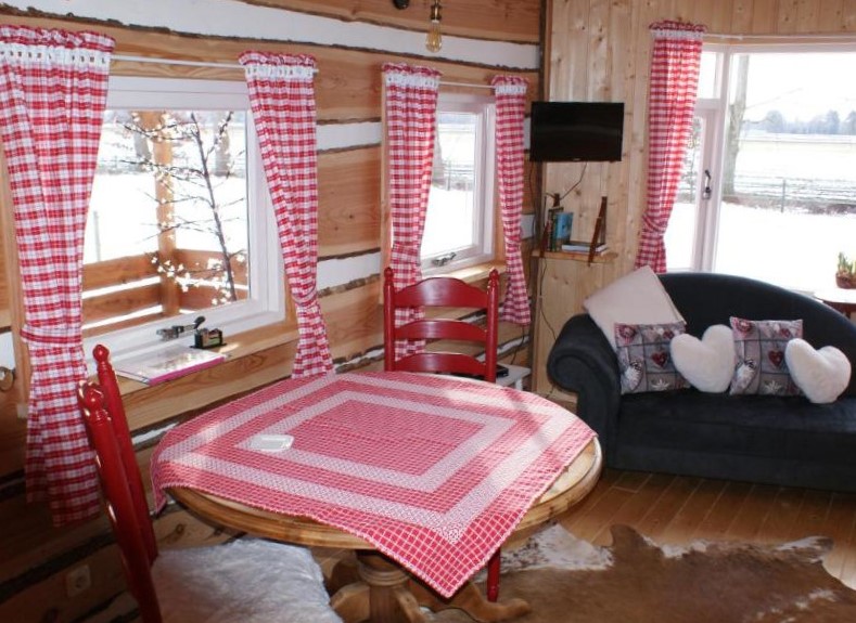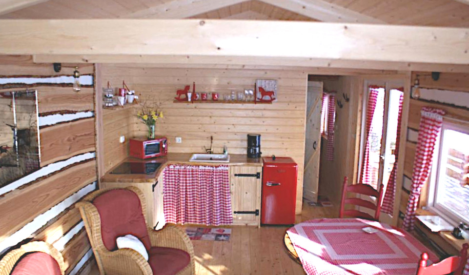 - een woonkamer met pelletkachel en flatscreen tv; een open keuken met koelkast, oven en magnetron;
